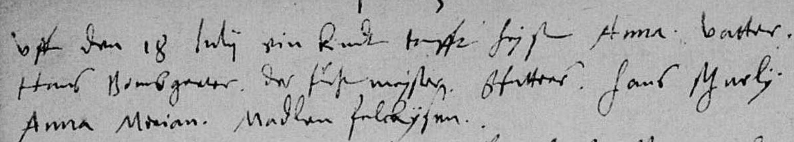 Two Hans’ children have interesting inclusions within their baptismal records. He is identified as “Hans Baumgarter der Fechtmeister” for the baptism of his daughter Anna in 1569, reflecting his status in Basel.